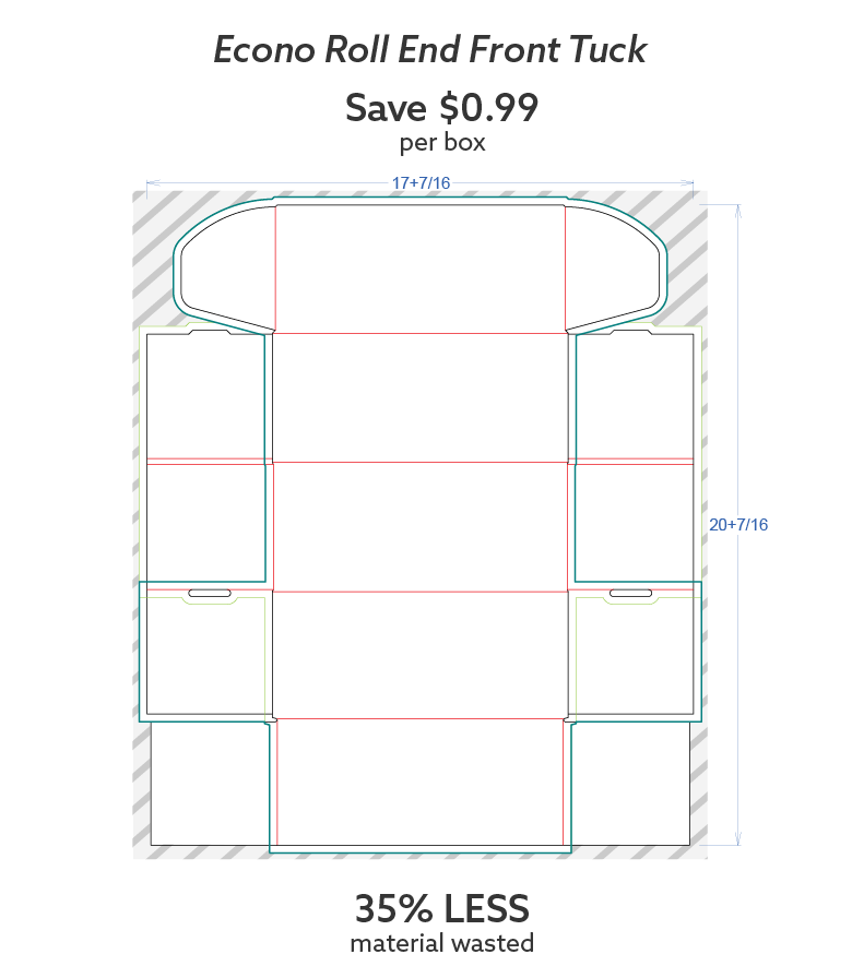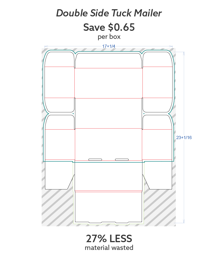 Traditional roll end front tuck mailers are dependable, but their layouts are not always the most material-efficient. Depending on the box dimensions, excess board can be built into the design simply due to how the dieline is structured.